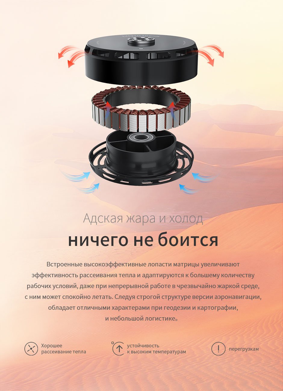 Характеристики: Отличное охлаждение; Пыле-/водонепроницаемость/антикоррозионная защита; Длительное время полета с большой грузоподъемностью