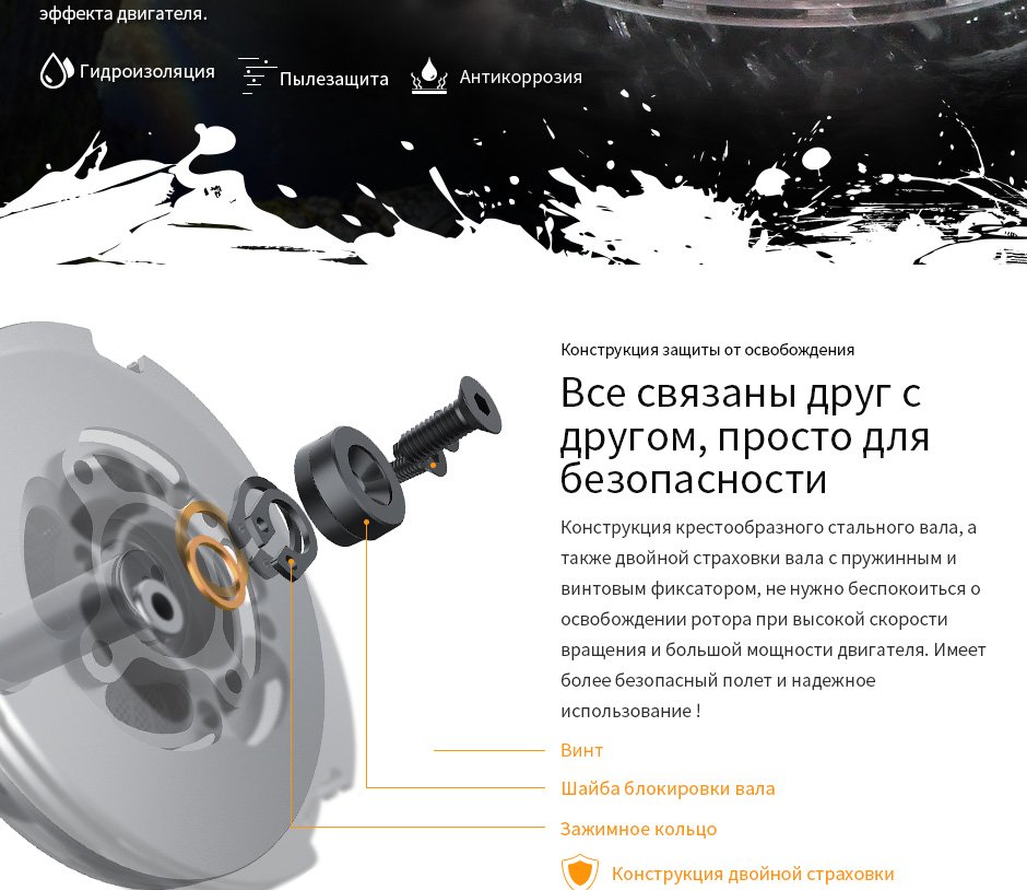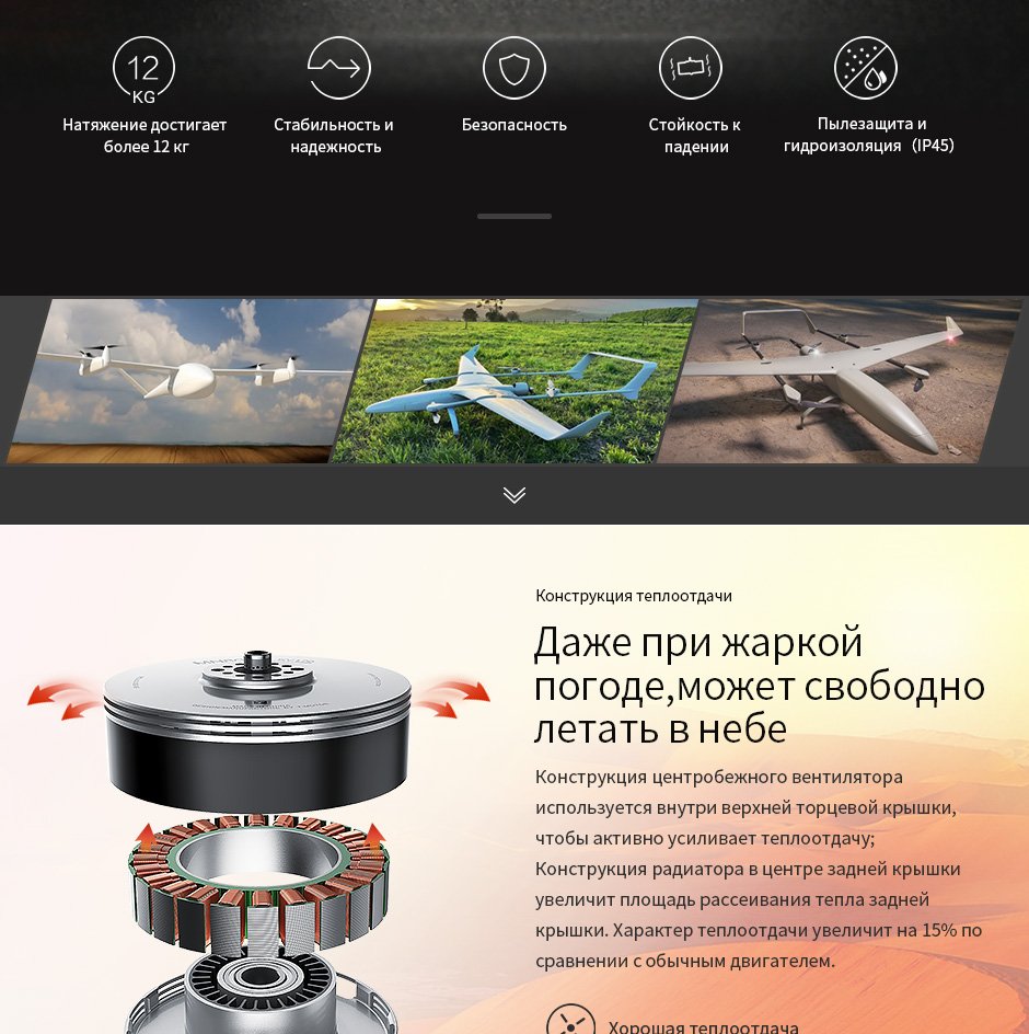 Характеристики: Отличное охлаждение; Пыле-/водонепроницаемость/антикоррозионная защита; Длительное время полета с большой полезной нагрузкой