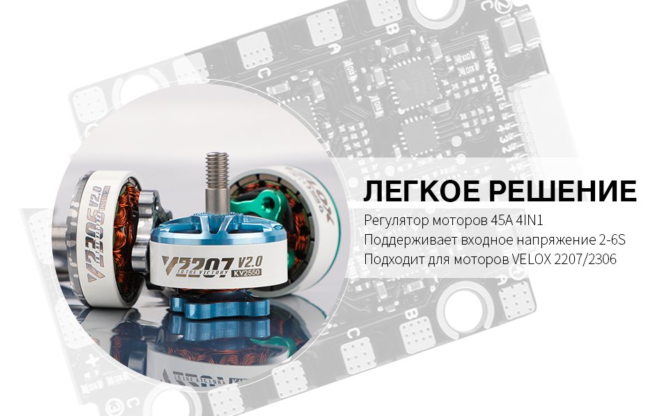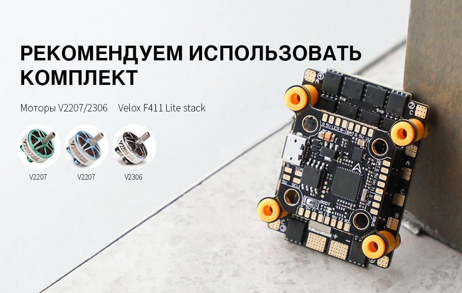 Этот комплект оснащен BEC 5 В 2 А, чипом OSD AT 7456E и черным модулем 8 МБ. Рекомендуем двигатель T-Motor Velox 2207/2306.
