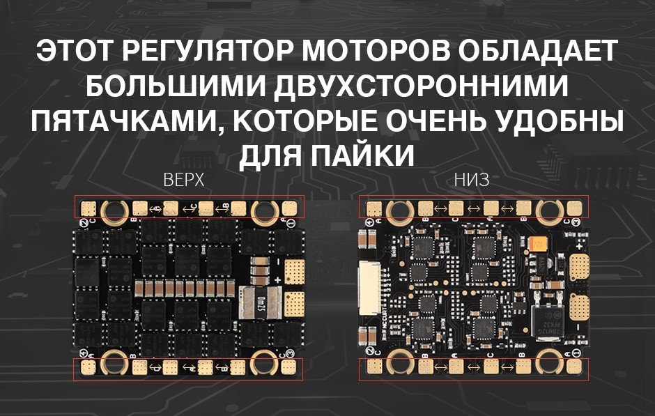 Регулятор скорости поддерживает входное напряжение 3-6S и прошивку BLHeli_S. Регулятор скорости имеет двухсторонние контактные площадки с большим расстоянием между ними, что упрощает сварку.