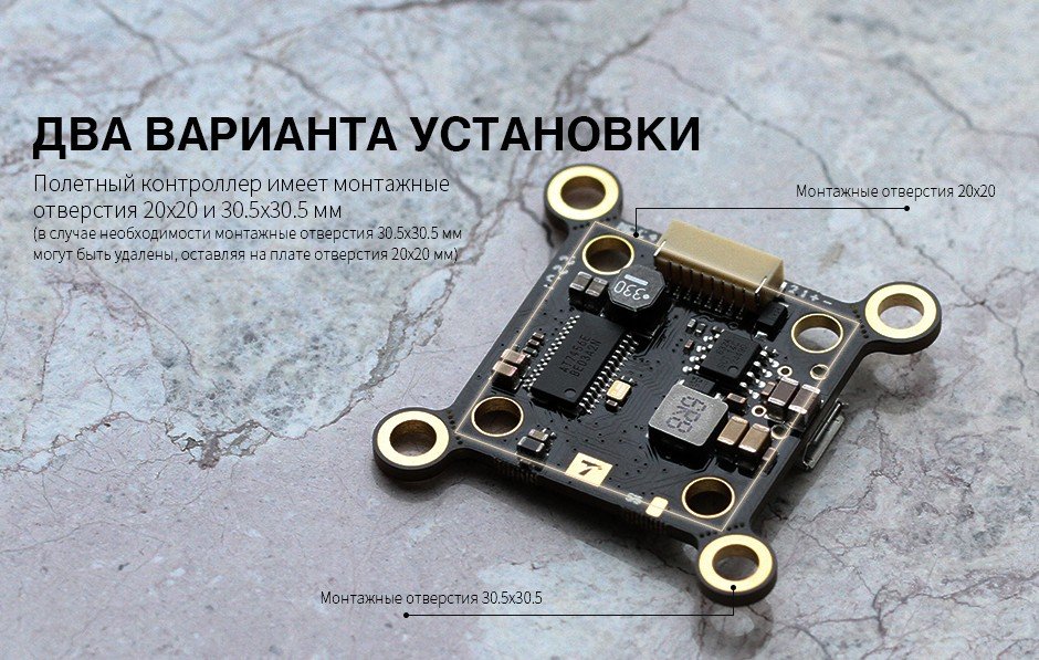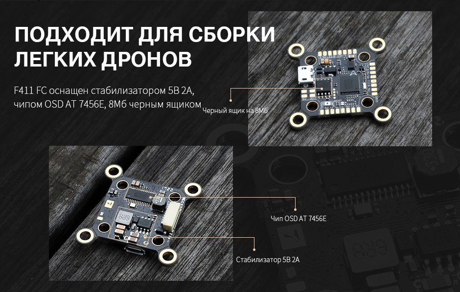 Полетный контроллер F411 оснащен BEC 5 В, чипом OSD AT 7456E и черным модулем 8 МБ для легких летательных аппаратов. Два варианта установки: 20*20 и 30,5*30,5.